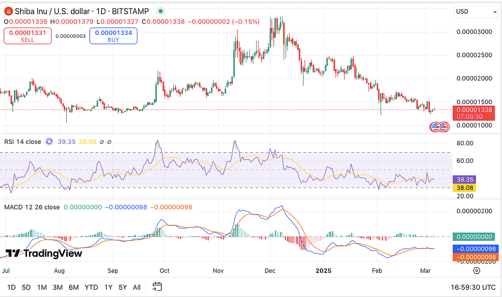 Meanwhile, the Moving Average Convergence Divergence (MACD) indicator shows SHIB in a consolidation phase. The MACD line is hanging below the signal line—basically a sign that bearish momentum is still lingering. But here’s the interesting part: the histogram bars are shrinking, which hints that the selling pressure might be easing up. If that trend continues, we could see SHIB gearing up for its next big move.